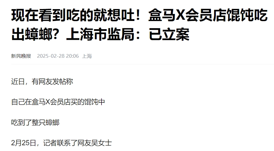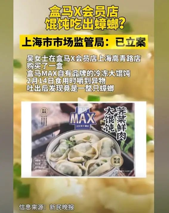 2月28日,据《新民晚报》等多家媒体报道,近日上海的吴女士在盒马X会员店上海高青路店购买的冷冻大馄饨中嚼到异物——吐出后发现竟是一整只蟑螂。