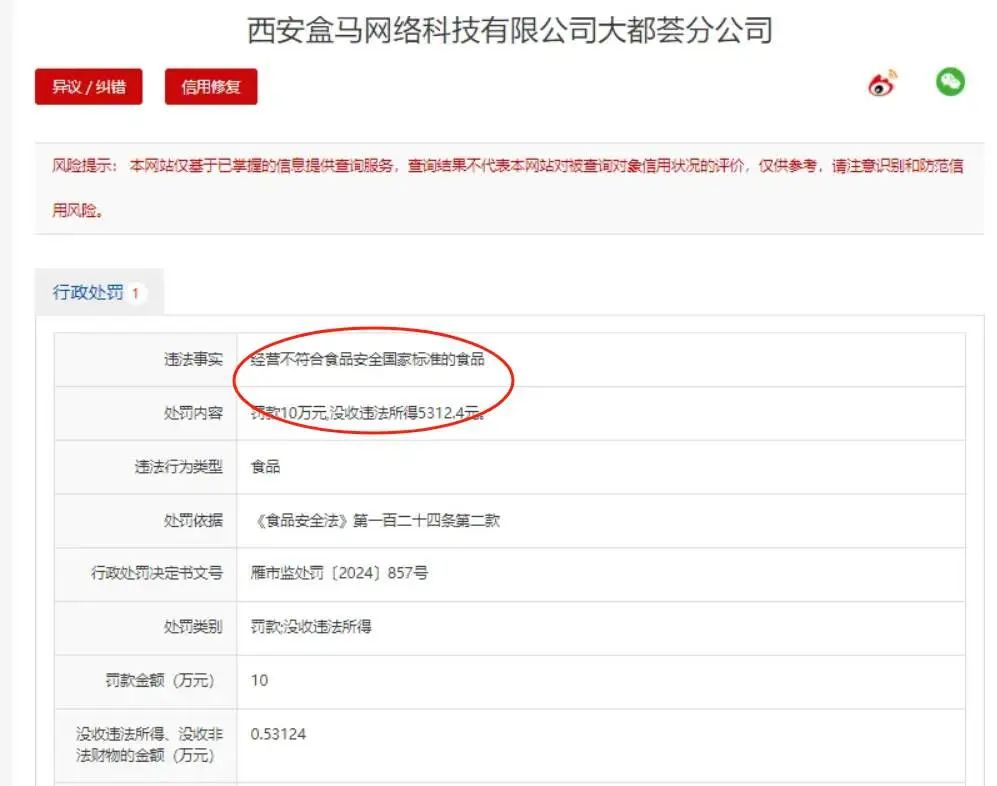 2月24日,西安市雁塔区市场监督管理局公布一则行政处罚决定书,西安盒马网络科技有限公司大都荟分公司因经营不符合食品安全国家标准的食品,被依法处以罚款10万元,并没收违法所得5312.4元。