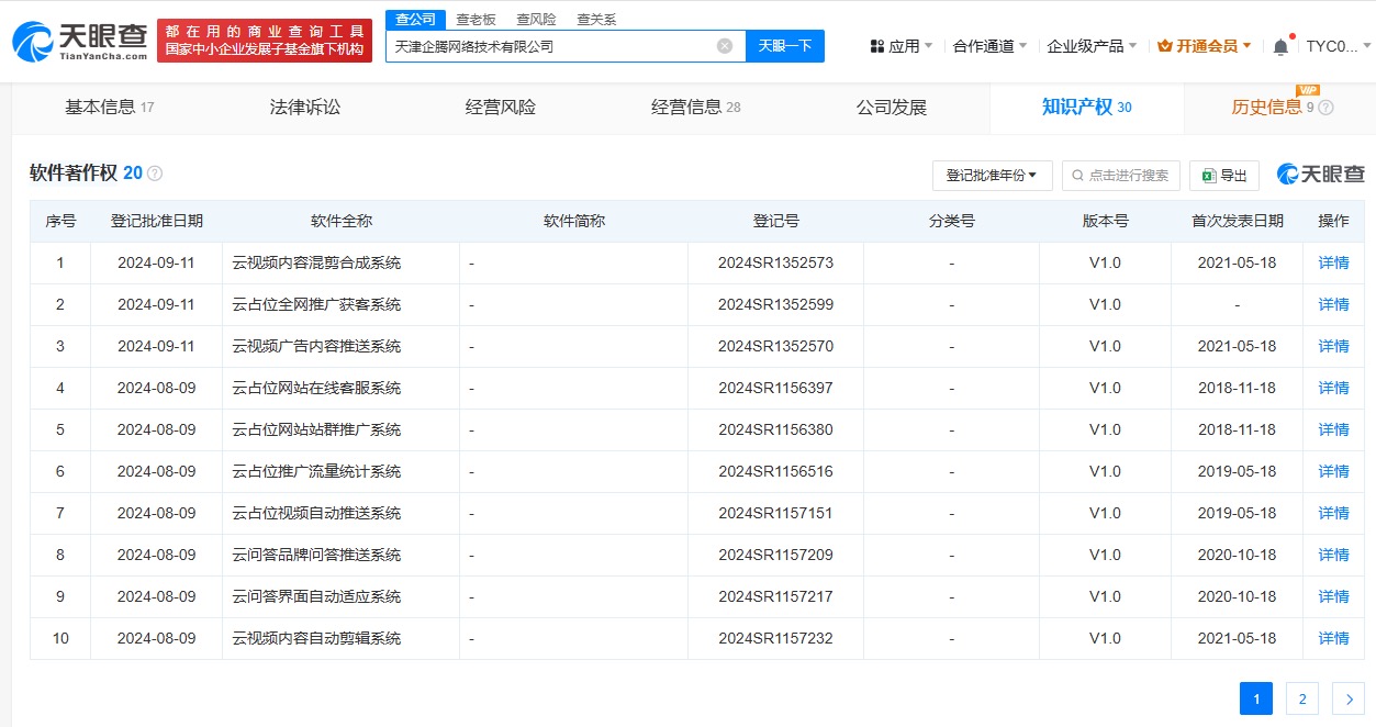 天眼查App显示,天津企腾网络技术有限公司成立于2022年3月,法定代表人为高金新,注册资本100万人民币,经营范围包括信息系统集成服务、信息技术咨询服务、企业管理咨询、技术进出口等,由高金新全资持股。知识产权信息显示,该公司已登记多个软件著作权,包括“云视频内容混剪合成系统”“云占位全网推广获客系统”等。