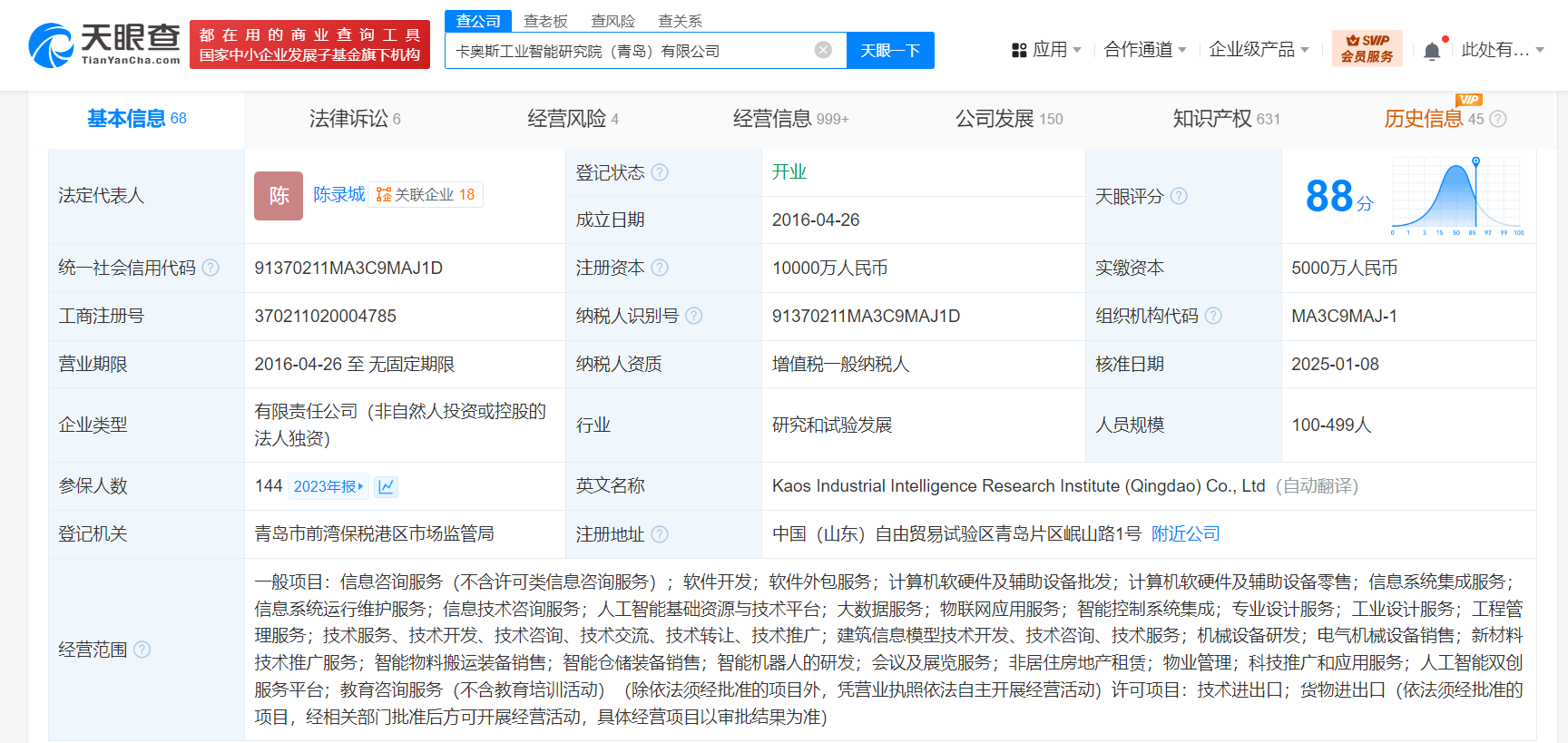 天眼查App显示,近日,卡奥斯工业智能研究院(青岛)有限公司发生工商变更,注册资本由5000万人民币增至1亿人民币。