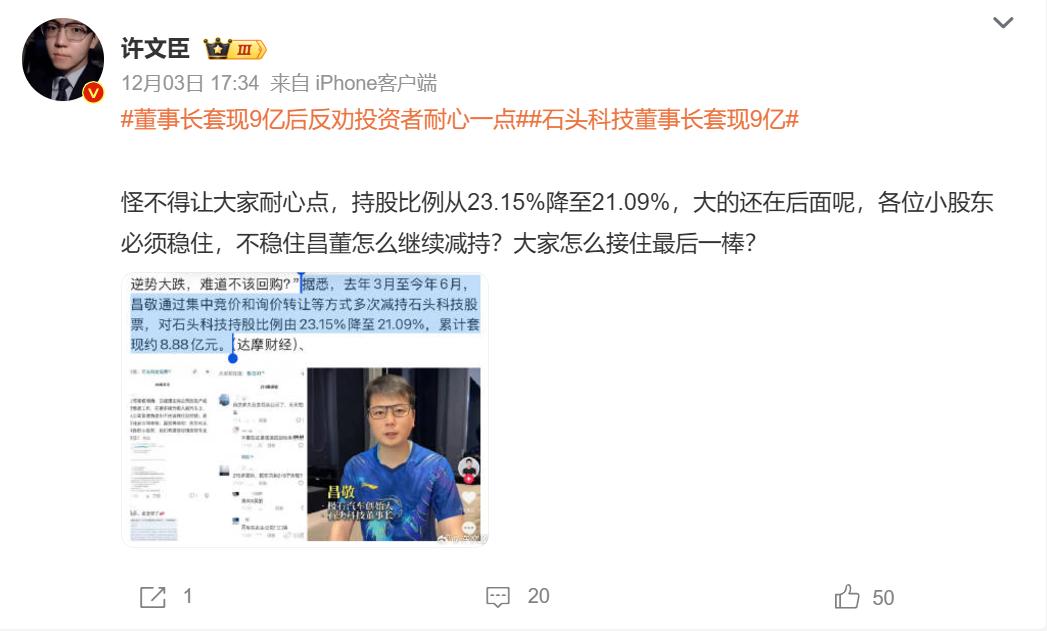 还有网友阴阳怪气:“ 怪不得让大家耐心点,持股比例从 23.15% 降至 21.09%,大的还在后面呢,各位小股东必须稳住,不稳住昌董怎么继续减持?大家怎么接住最后一棒?”