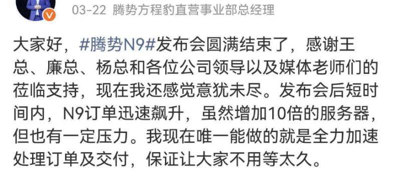 而有意思的是,“服务器问题”在此前腾势Z9 GT、腾势N9上市过程中,在赵长江的口中曾屡屡出现。腾势N9上市后,赵长江曾说,“发布会后短时间内,N9订单迅速飙升,虽然增加10倍的服务器但也有一定压力。”去年8月20日,腾势Z9 GT上市后,其称,“今天技术发了、价格公布了、服务器崩了。”