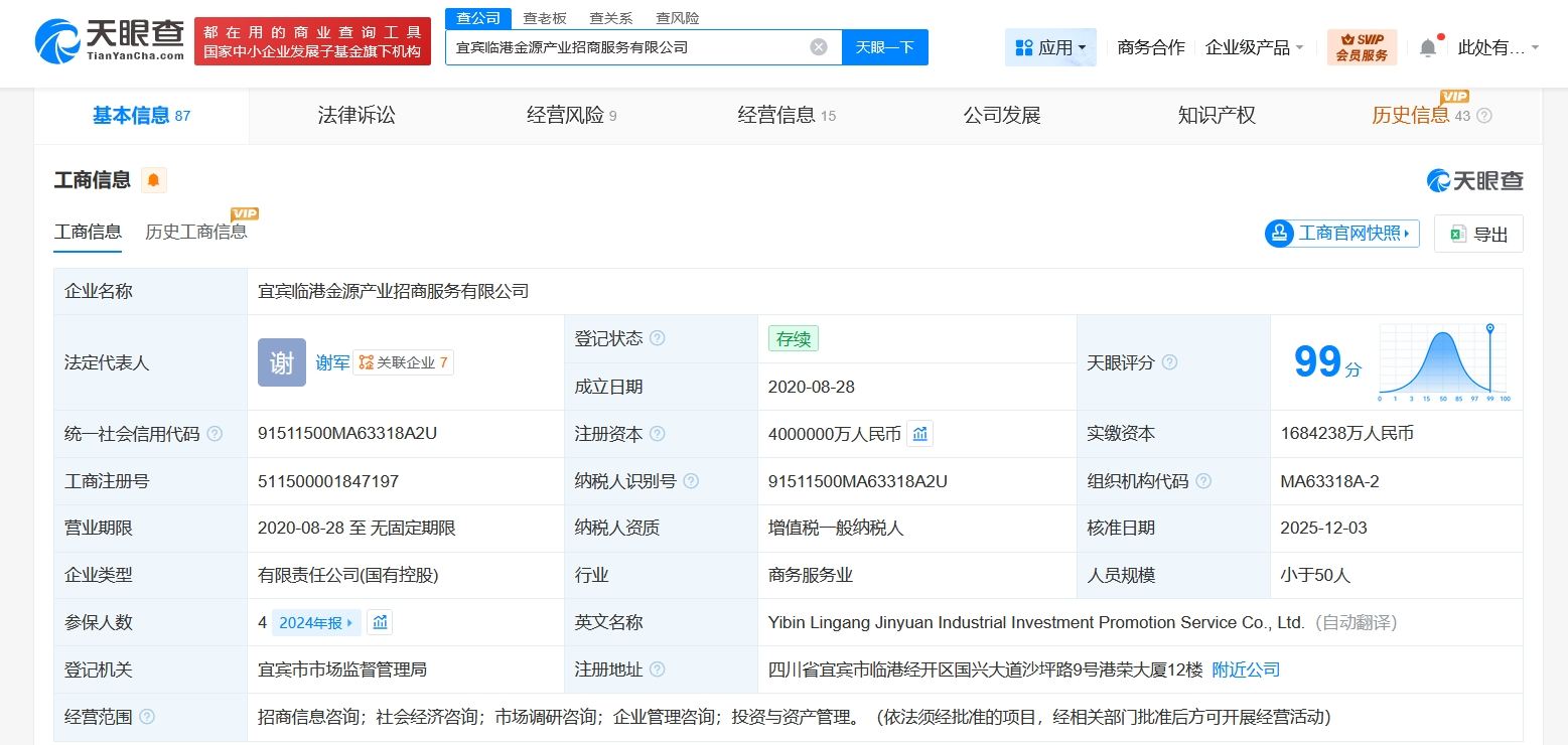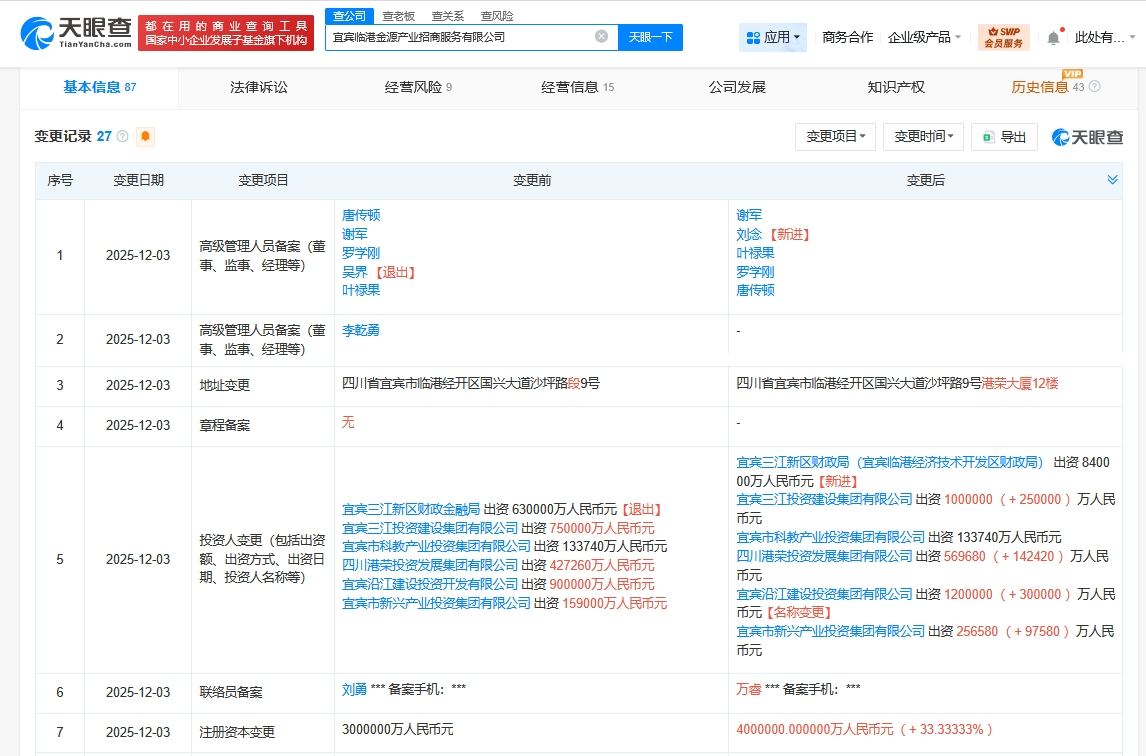 天眼查工商信息显示,近日,宜宾临港金源产业招商服务有限公司发生工商变更,注册资本由300亿人民币增至400亿人民币,增幅约33%,同时,部分高管发生变更。