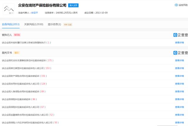 此外在企查查检索得到的消息来看,众安在线提示的自身风险以及关联风险数量有些过于多。
