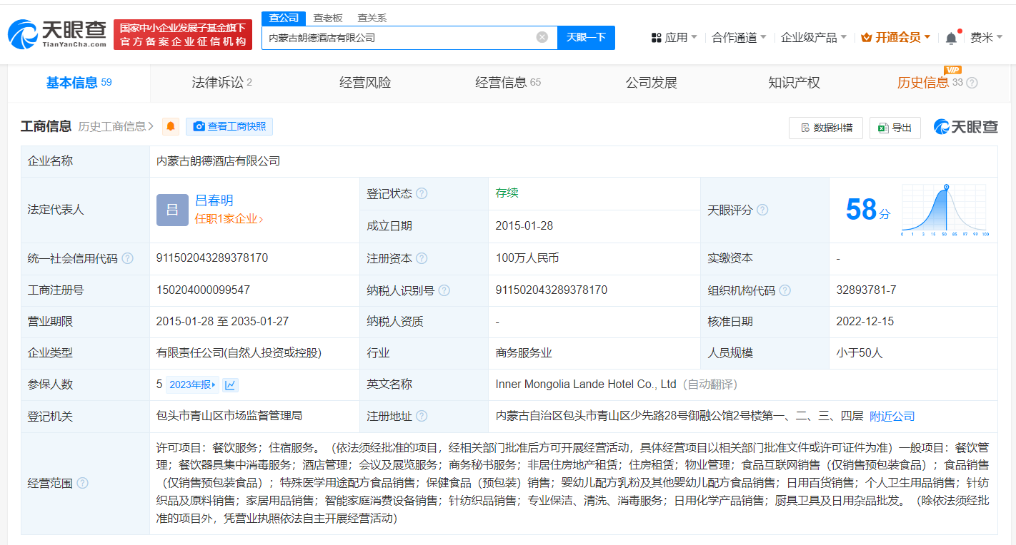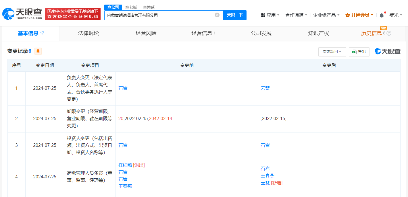 天眼查App显示,涉事酒店内蒙古朗德酒店有限公司成立于2015年1月,法定代表人为吕春明,注册资本100万人民币,由石志国、石岩、吕春明共同持股,变更记录显示,该公司注册资本曾于3年前由5000万人民币减至100万人民币。此外,石岩还全资持股1家内蒙古朗德酒店管理有限公司,该公司成立于2022年2月,法定代表人为云慧,注册资本100万人民币。变更记录显示,今年7月,石岩卸任该公司法定代表人。