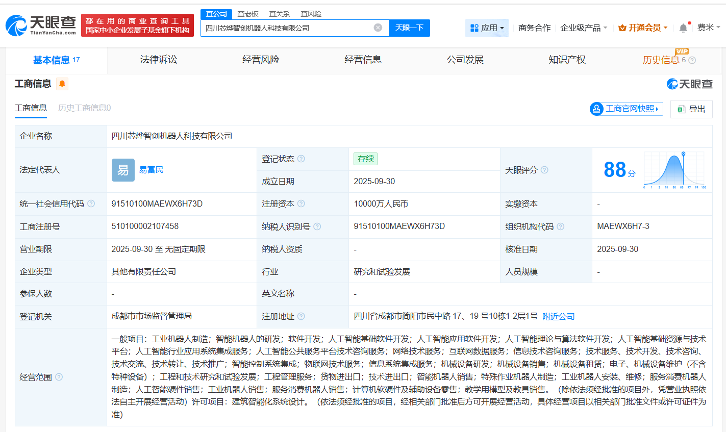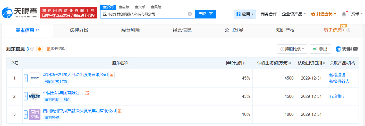 天眼查App显示,近日,四川芯烨智创机器人科技有限公司成立,法定代表人为易富民,注册资本1亿人民币,经营范围包括工业机器人制造、智能机器人的研发、人工智能基础软件开发等,由中国五冶集团有限公司、机器人(300024)、四川简州空港产融投资发展集团有限公司共同持股。