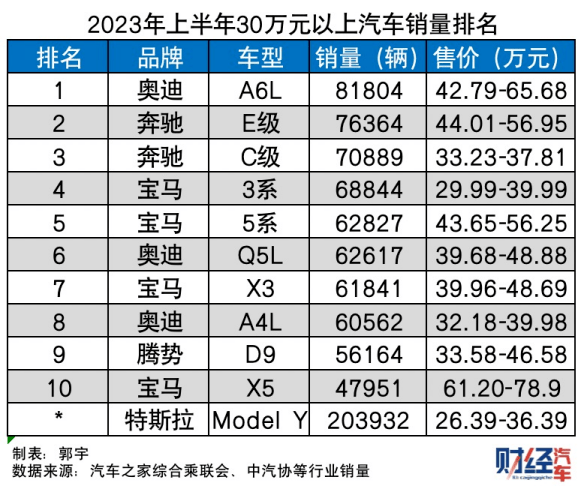 若以起售价30万元(含29.99万元)为基准线,单一车型销量最高的是奥迪A6L,2023年上半年共卖出了8.18万辆。
