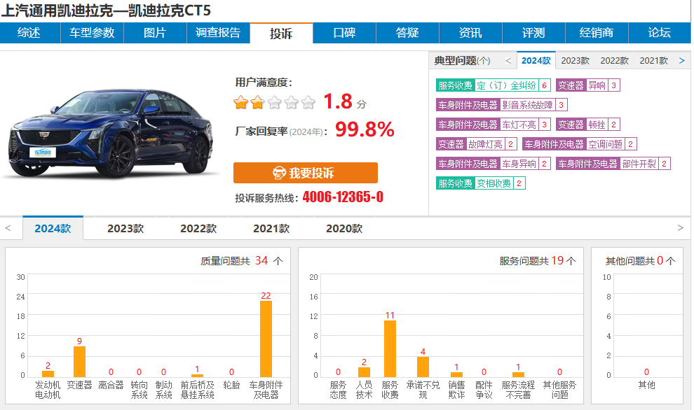 4S店跑路只是凯迪拉克问题的冰山一角,在汽车投诉网站车质网,凯迪拉克旗下XT5、XT4、CT5、XTS、XT6、CT6等多款车型均有投诉,投诉的内容有维修人员技术差、刹车失灵、发动机烧机油、熄火、减震异响、漆面起泡开裂、变速器拖档、共振、异响等。