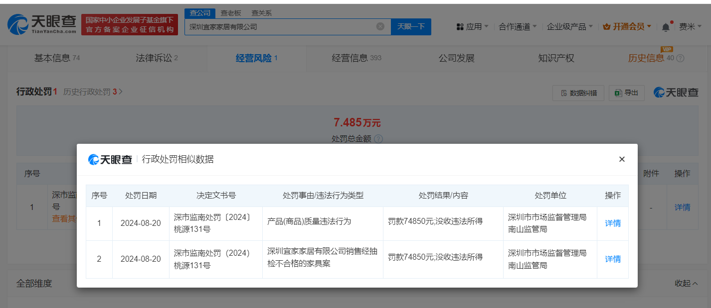 天眼查经营风险信息显示,近日,深圳宜家家居有限公司因销售经抽检不合格的家具,被深圳市市场监督管理局南山监管局罚款7.4万余元。