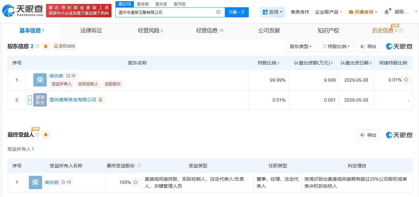 该公司成立于今年5月,法定代表人为柴向前(柴怼怼),注册资本10万人民币,经营范围包括珠宝首饰制造、珠宝首饰批发、珠宝首饰回收修理服务等,由柴向前及其名下温州道莱珠宝有限公司共同持股。