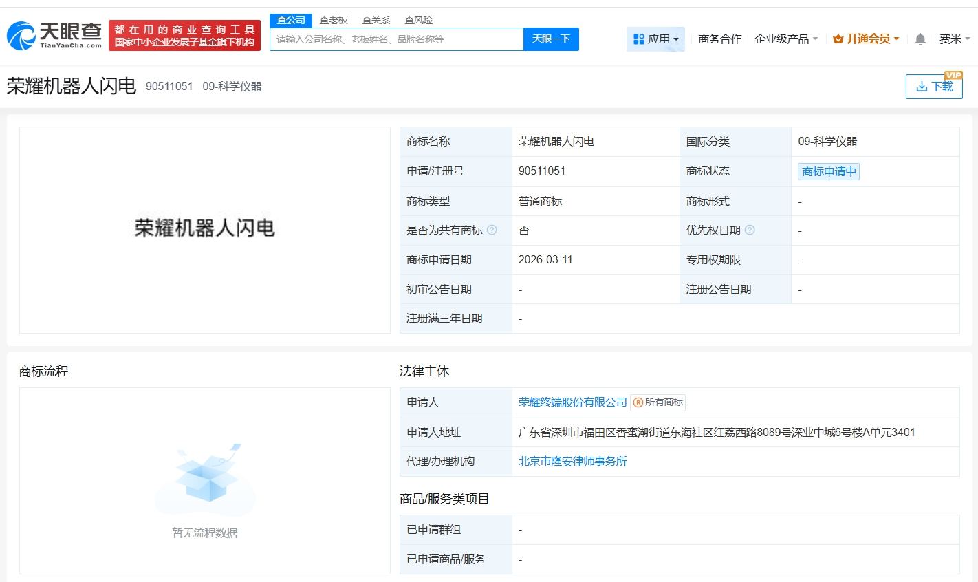 天眼查知识产权信息显示,近日,荣耀终端股份有限公司申请注册“荣耀机器人闪电”商标,国际分类为科学仪器,当前商标状态为等待实质审查。