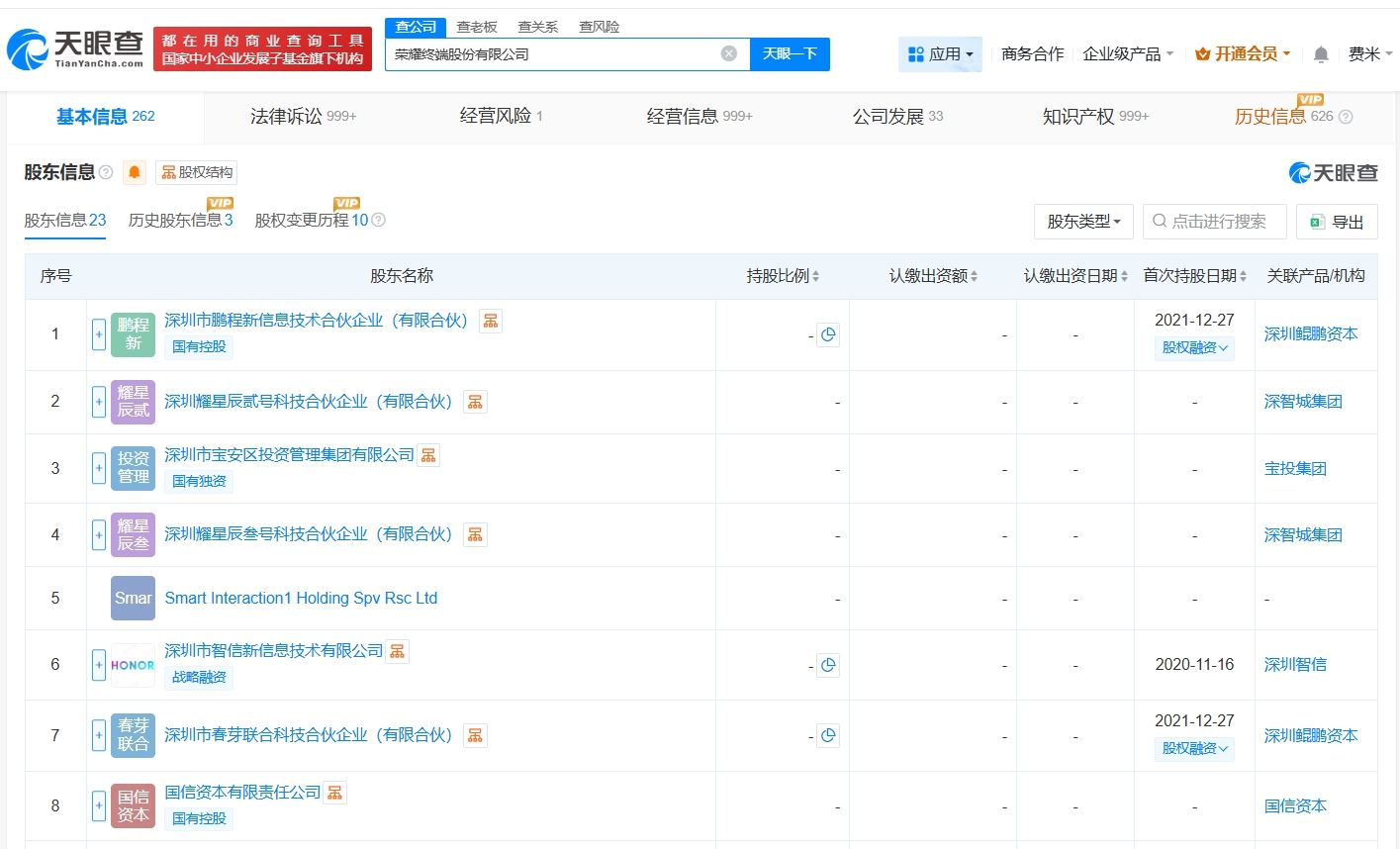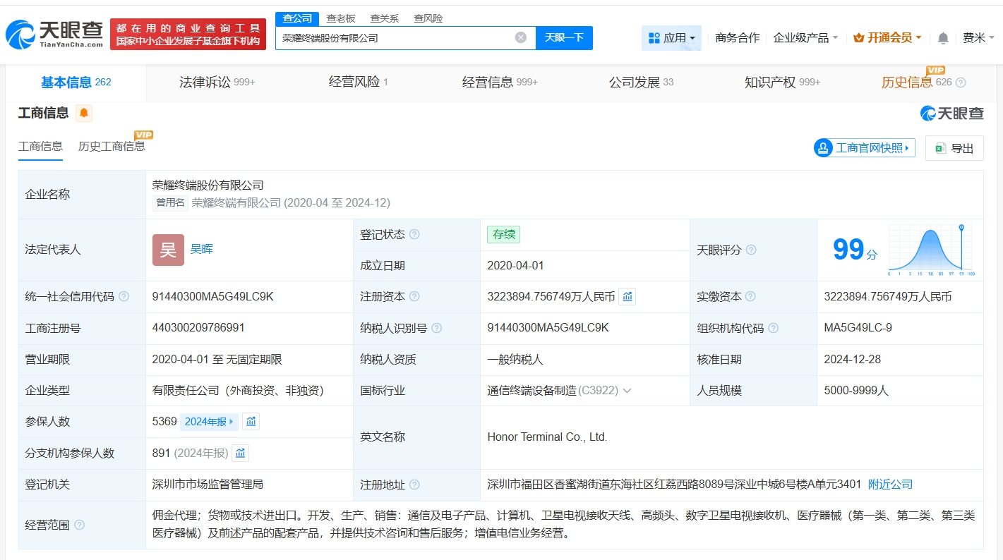 荣耀终端股份有限公司成立于2020年4月,法定代表人为吴晖,注册资本约322.4亿人民币,经营范围包括佣金代理、货物或技术进出口、增值电信业务经营等,由深圳市鹏程新信息技术合伙企业(有限合伙)、深圳耀星辰贰号科技合伙企业(有限合伙)、深圳市宝安区投资管理集团有限公司等共同持股。