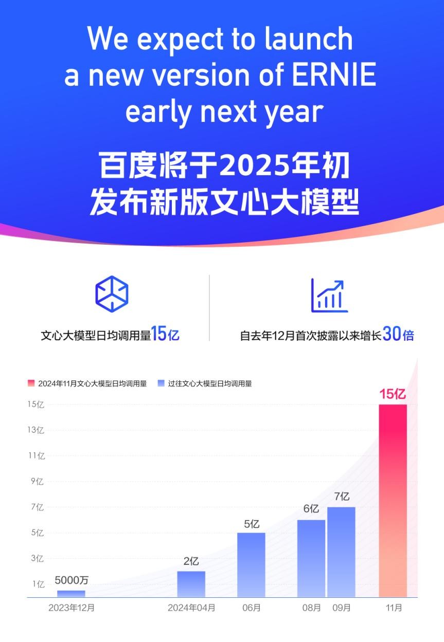 财报电话会上,百度方面表示,将持续迭代文心大模型的能力,优化模型效率。此外李彦宏还透露,百度将于2025年初发布文心大模型的新版本,以巩固在基础模型上的领先优势。