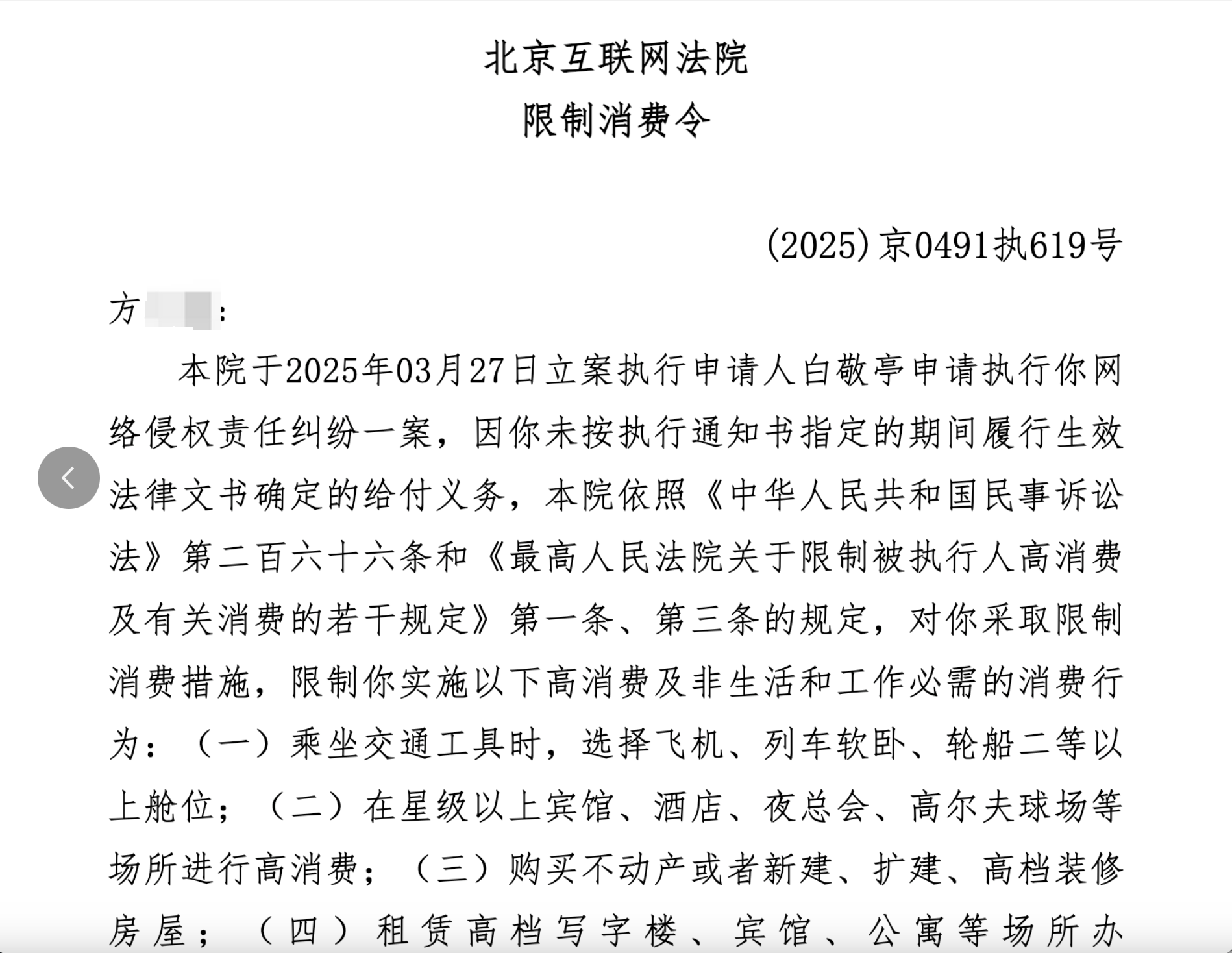 天眼查App显示,近日,白敬亭诉方某网络侵权责任纠纷案新增一则限制消费令信息,因未按执行通知书指定的期间履行生效法律文书确定的给付义务,被告方某被采取限制消费令措施。案件流程显示,今年3月,方某已被执行2万元。