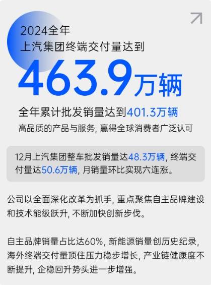 1月1日,上汽集团公布2024年全年累计批发销量达到401.3万辆,终端交付量达到463.9万辆。12月,上汽集团整车批发销量达48.3万辆,终端交付量达50.6万辆,月销量环比实现六连涨。根据此前制定的545万销量目标,上汽的整体表现还是较为可观的。