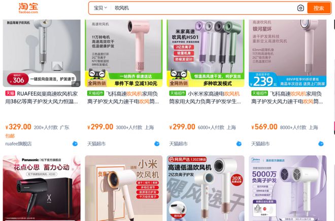 在高速吹风机的拉动下,吹风机规模连续多年增长,618期间销售额11.5亿元,同比增加了10.1%;销售量367万台,同比增加了7.8%。记者在淘宝输入“吹风机”进行搜索,发现销量靠前的产品在设计上都有几分戴森的“神韵”,包括岚斐、飞科、米家、网易严选等品牌。