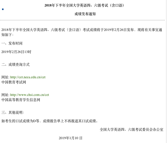 【TechWeb】2月26日,根据全国大学英语四、六级考试委员会办公室发布的通知显示,2018下半年英语四六级笔试成绩查询时间开通时间为2019年2月26日13:00,也就是今天下午1点。你可以通过以下途径查询分数。