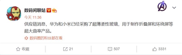 近日消息,博主@数码闲聊站透露,小米和华为已经采购了超薄柔性玻璃,用于折叠屏和环绕屏等超大曲率产品。