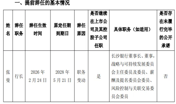 2026年初,长沙银行股份有限公司发布临时公告,宣布行长张曼辞任。
