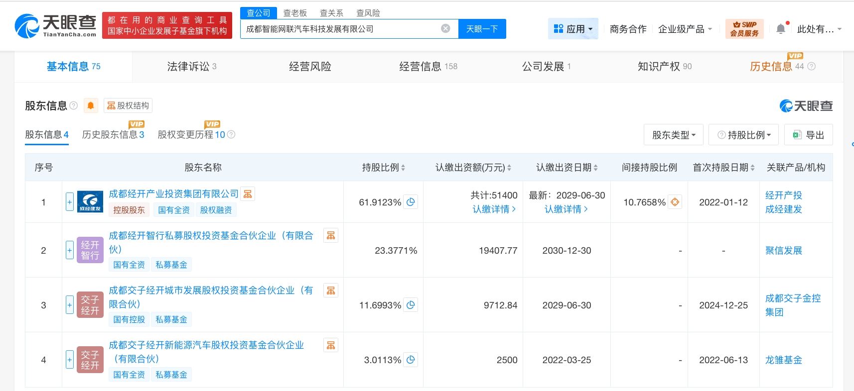 成都智能网联汽车科技发展有限公司成立于2018年5月,法定代表人为曾邦余,经营范围包括网络预约出租汽车经营服务、机动车检验检测服务、供电业务等。股东信息显示,该公司由成都经开产业投资集团有限公司、成都交子经开城市发展股权投资基金合伙企业(有限合伙)、成都交子经开新能源汽车股权投资基金合伙企业(有限合伙)及上述新增股东共同持股。