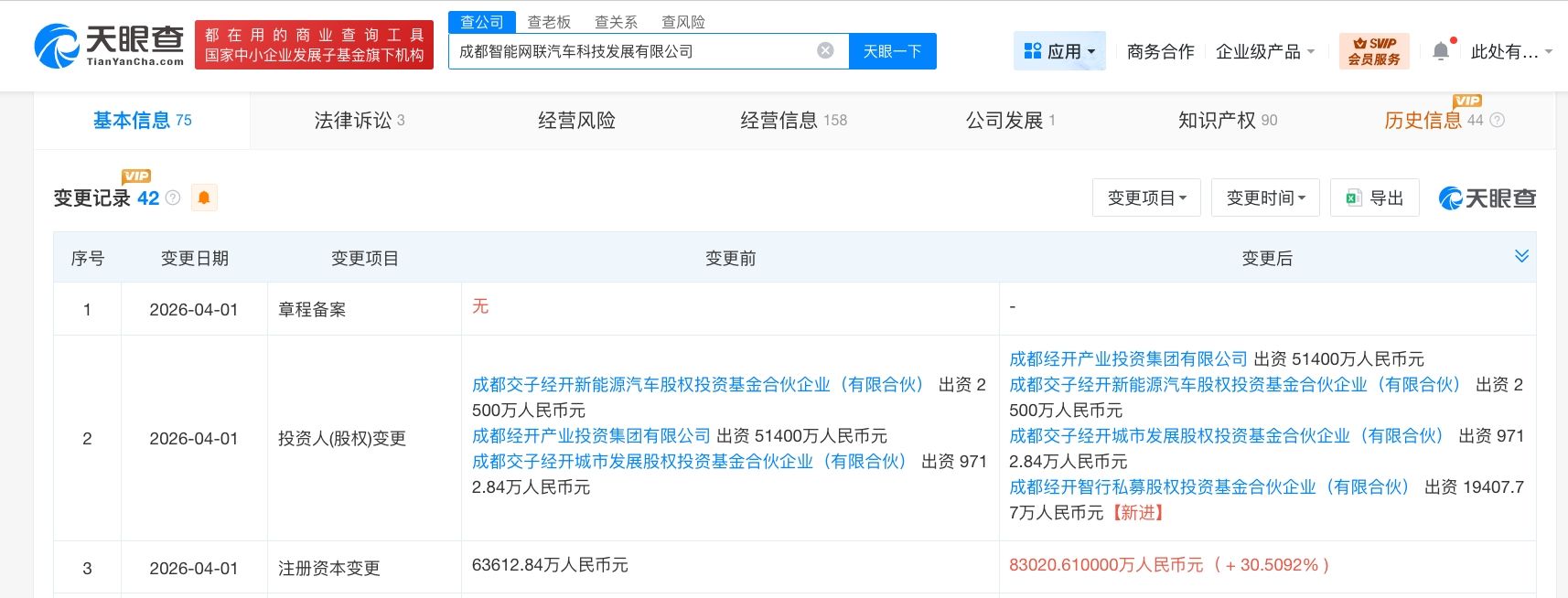 天眼查App显示,近日,成都智能网联汽车科技发展有限公司发生工商变更,注册资本由约6.4亿人民币增至约8.3亿人民币,增幅约31%,同时新增成都经开智行私募股权投资基金合伙企业(有限合伙)为股东。