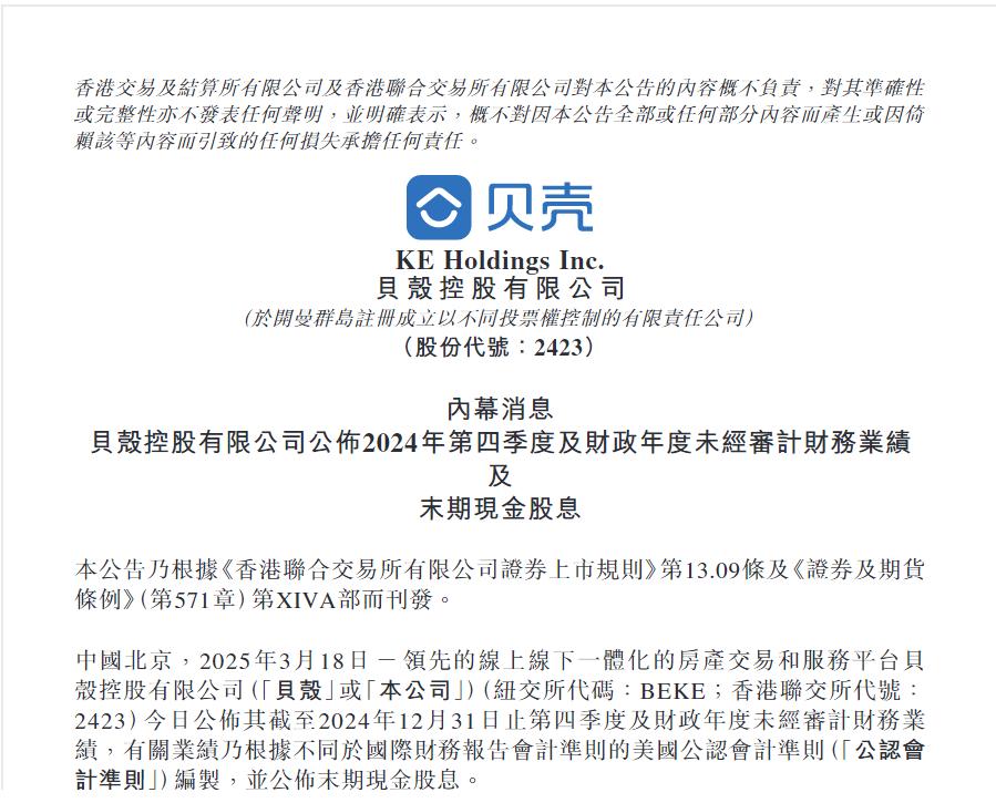 财报显示,2024年贝壳实现净收入为935亿元,同比增长20.2%;净利润为40.78亿元,同比下降30.8%;经调整后净利润为72.11亿元,同比下降26.4%。