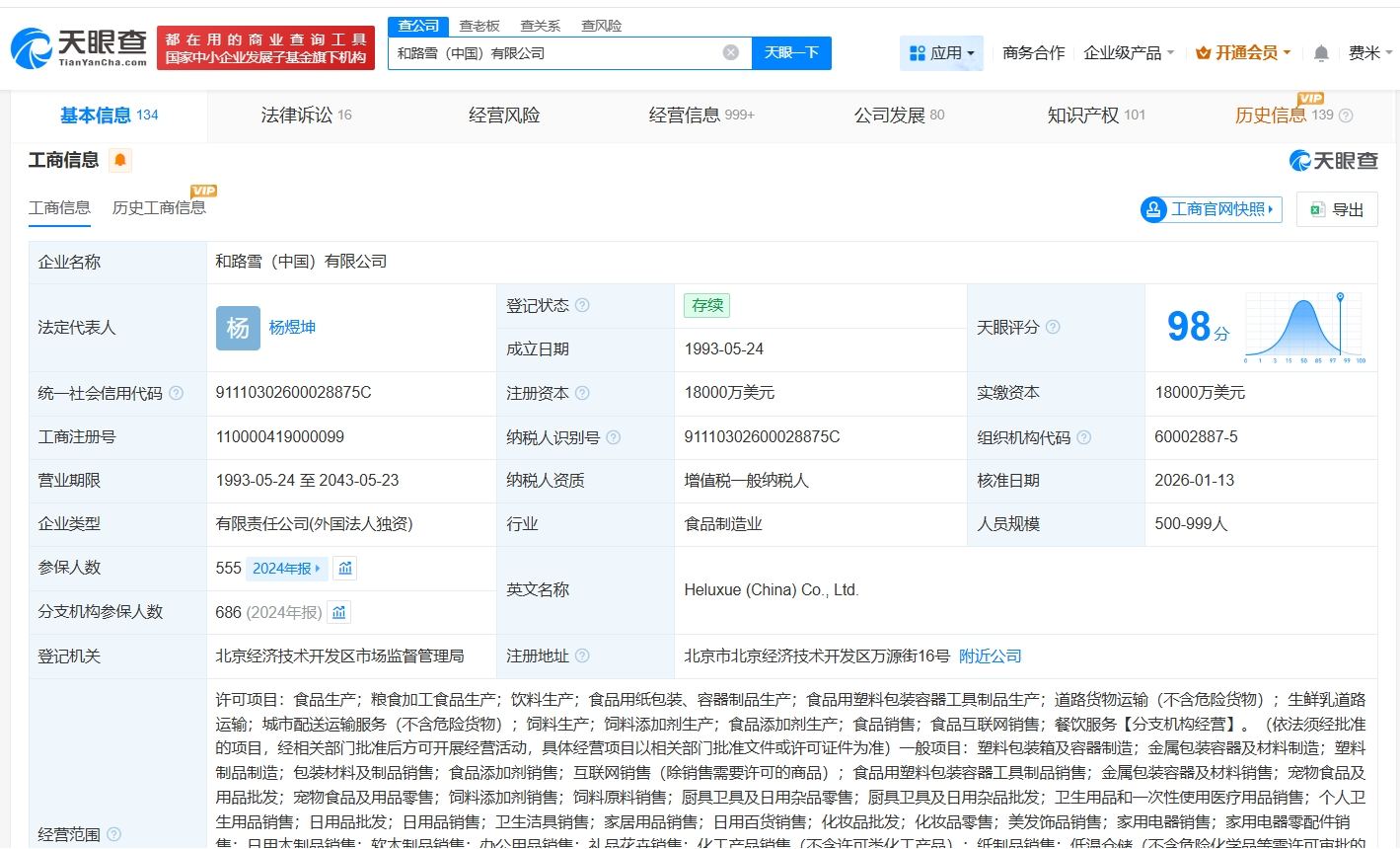 天眼查工商信息显示,近日,和路雪(中国)有限公司发生工商变更,徐宇淙由法定代表人、经理、董事长改任董事,杨煜坤接替法定代表人、经理,罗慧芬(LOH WAI FUNG)接任董事长。