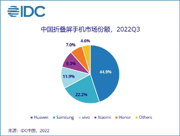 根据IDC中国提供的数据,Q3季度国内折叠屏手机出货量超100万部,华为以44.9%的份额称霸折叠屏市场,三星则以22.2%的份额位居第二,紧随其后的是vivo、小米、荣耀。