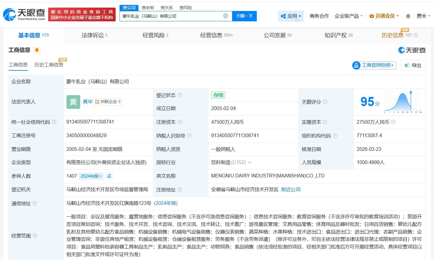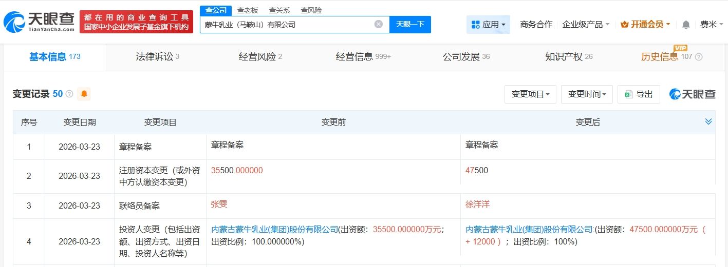 天眼查App显示,近日,蒙牛乳业(马鞍山)有限公司发生工商变更,注册资本由3.55亿人民币增至4.75亿人民币,增幅约34%。