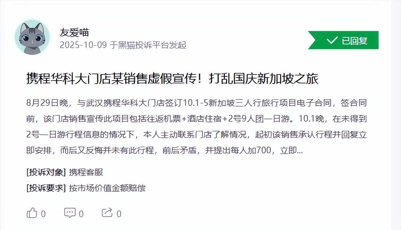 一位网友投诉:“与武汉携程华科大门店签订10.1-5新加坡三人行旅行项目电子合同,签合同前,该门店销售宣传此项目包括往返机票+酒店住宿+2号9人团一日游。10.1晚,在未得到2号一日游行程信息的情况下,本人主动联系门店了解情况,起初该销售承认行程并回复立即安排,而后又反悔并未有此行程,前后矛盾,并提出每人加700,立即安排一日游,打乱了我们一家三口整个旅游行程。”