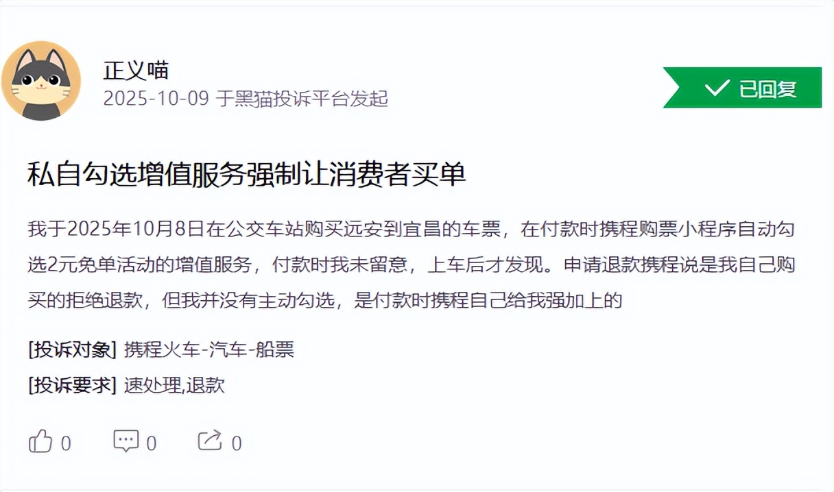 还有一位网友表示:“我于2025年10月8日在公交车站购买远安到宜昌的车票,在付款时携程购票小程序自动勾选2元免单活动的增值服务,付款时我未留意,上车后才发现。申请退款携程说是我自己购买的拒绝退款,但我并没有主动勾选,是付款时携程自己给我强加上的。”