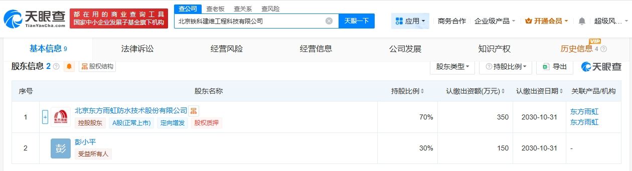 天眼查App显示,近日,北京铁科建维工程科技有限公司成立,法定代表人为彭小平,注册资本500万人民币,经营范围包括建筑材料销售、建筑装饰材料销售、轻质建筑材料销售、密封用填料销售等。股东信息显示,该公司由东方雨虹(002271)、彭小平共同持股。