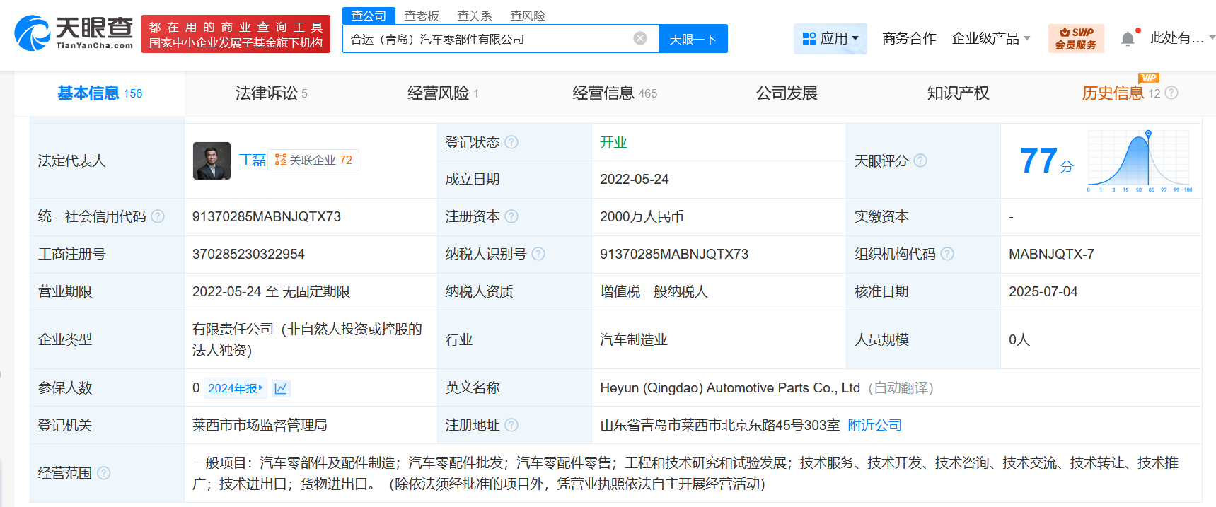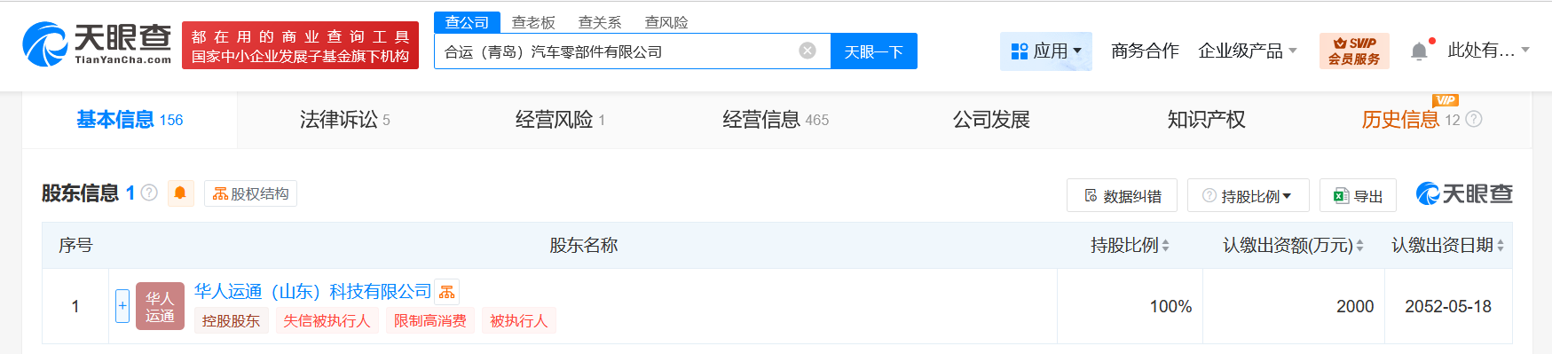 合运(青岛)汽车零部件有限公司成立于2022年5月,注册资本2000万人民币,经营范围含汽车零部件及配件制造、汽车零配件批发、汽车零配件零售、工程和技术研究和试验发展等,由华人运通(山东)科技有限公司全资持股。