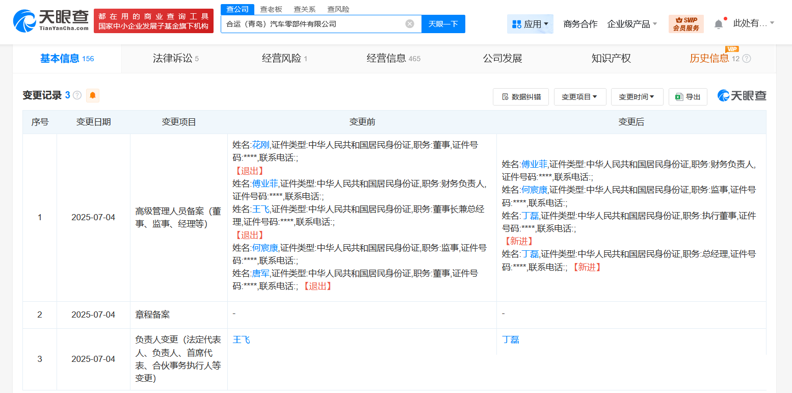 天眼查App显示,近日,合运(青岛)汽车零部件有限公司发生工商变更,王飞卸任法定代表人、董事长兼总经理,由丁磊接任法定代表人、总经理并担任执行董事,同时,部分主要人员也发生变更。