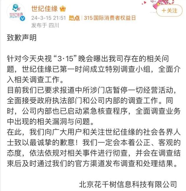值得一提的是,今年央视3·15晚会曝光珍爱网、世纪佳缘、恋爱课等多家婚恋平台涉嫌用优质的异性资源、0门槛的诱人广告、言之凿凿的成功案例作为噱头,欺骗消费者。对此,世纪佳缘致歉称,第一时间成立特别调查小组,全面介入相关调查工作。目前公司已要求报道中所涉门店暂停一切经营活动,全面接受政府执法部门和公司内部的调查工作。同时,公司内部也已启动紧急核查程序,全面调查业务中出现的相关漏洞与问题。珍爱网官方微博发布致歉声明,称在第一时间成立专项小组,采取最严措施,全面深入调查并立即处理相关问题。