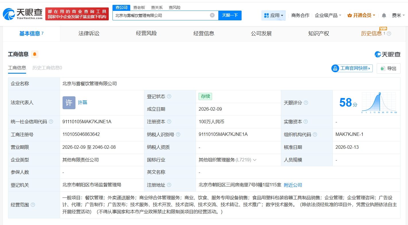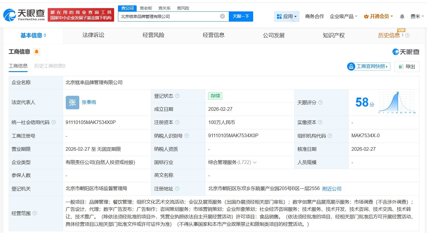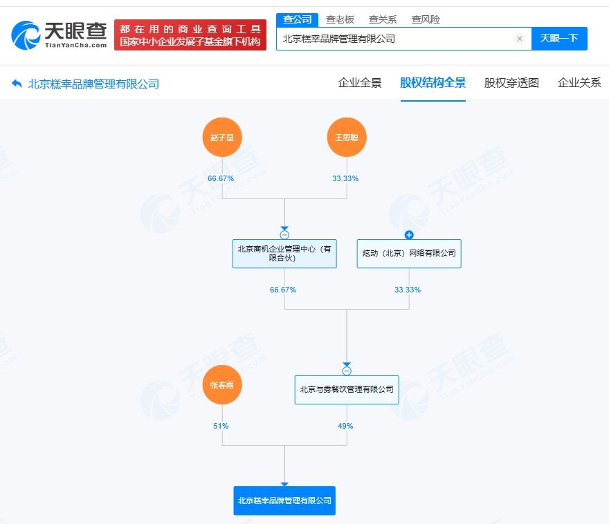 天眼查工商信息显示,近日,北京糕幸品牌管理有限公司成立,法定代表人为张春雨,注册资本100万人民币,经营范围含品牌管理、餐饮管理、食品销售等。股权全景穿透图显示,该公司由张春雨、北京与雾餐饮管理有限公司共同持股,其中王思聪通过北京商机企业管理中心(有限合伙)间接持股北京与雾餐饮管理有限公司。