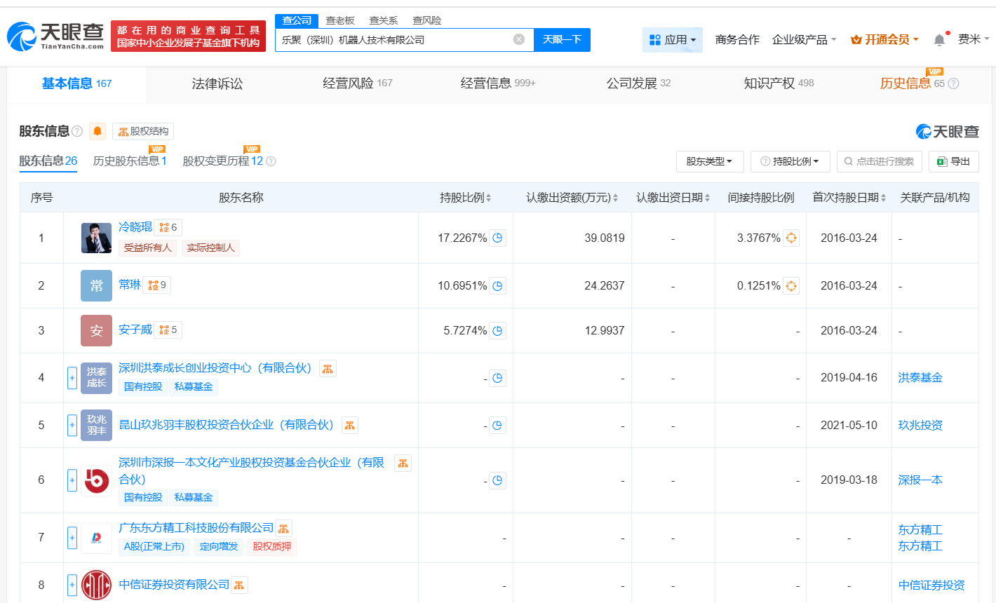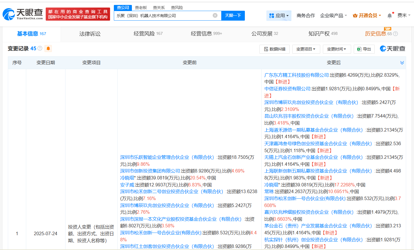 天眼查App显示,近日,乐聚(深圳)机器人技术有限公司发生工商变更,新增东方精工(002611)、中信证券投资有限公司、茅台旗下茅台金石(贵州)产业发展基金合伙企业(有限合伙)等为股东,注册资本由约190万人民币增至约227万人民币,同时部分高管发生变更。