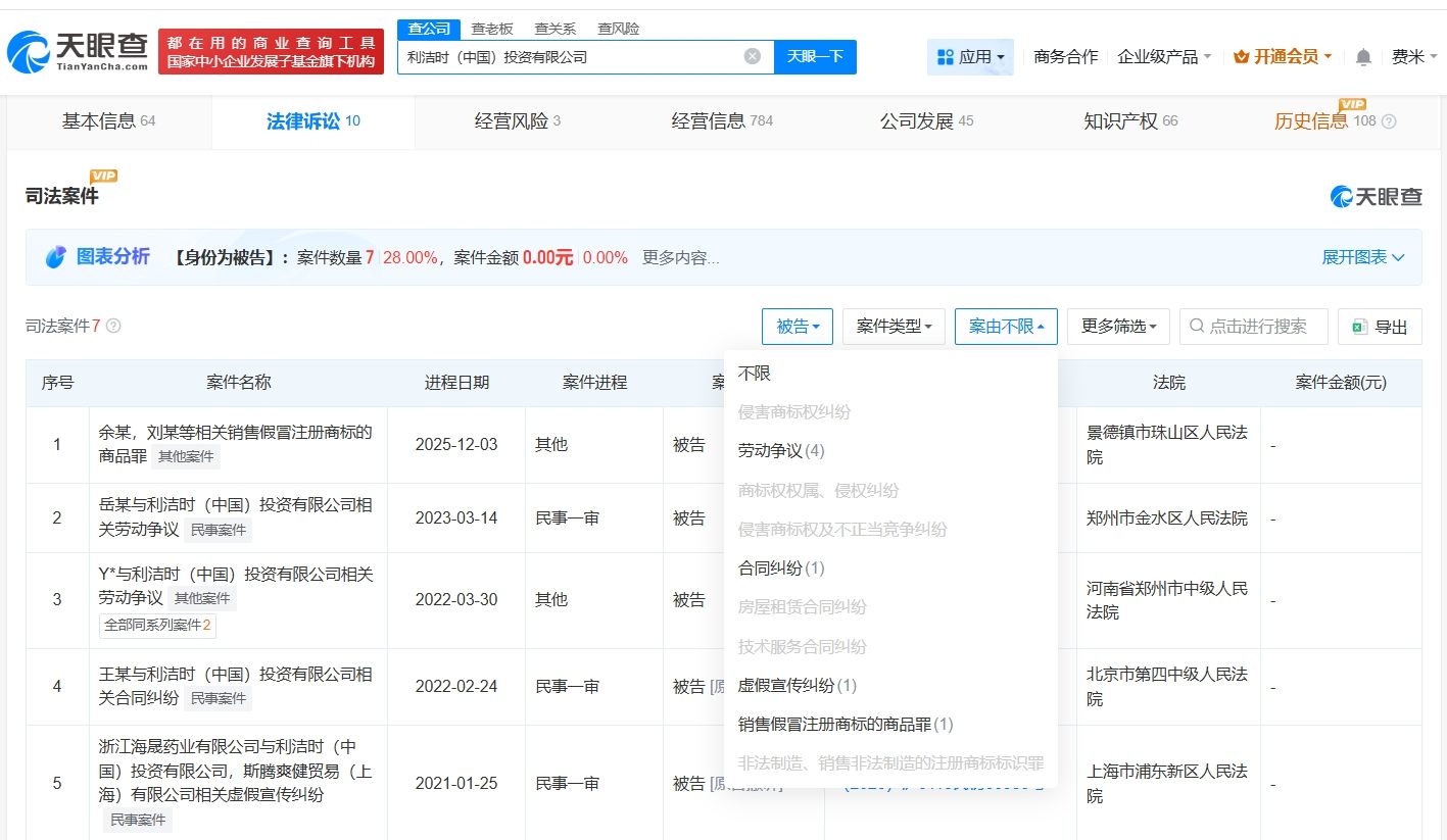 天眼查App显示,滴露关联公司利洁时(中国)投资有限公司成立于2014年1月,法定代表人为黄玮,注册资本8500万美元,经营范围包括以自有资金从事投资活动、机械设备销售、办公设备销售等,由利洁时有限公司全资持股。法律诉讼信息显示,该公司曾涉及合同纠纷、虚假宣传纠纷等案件。