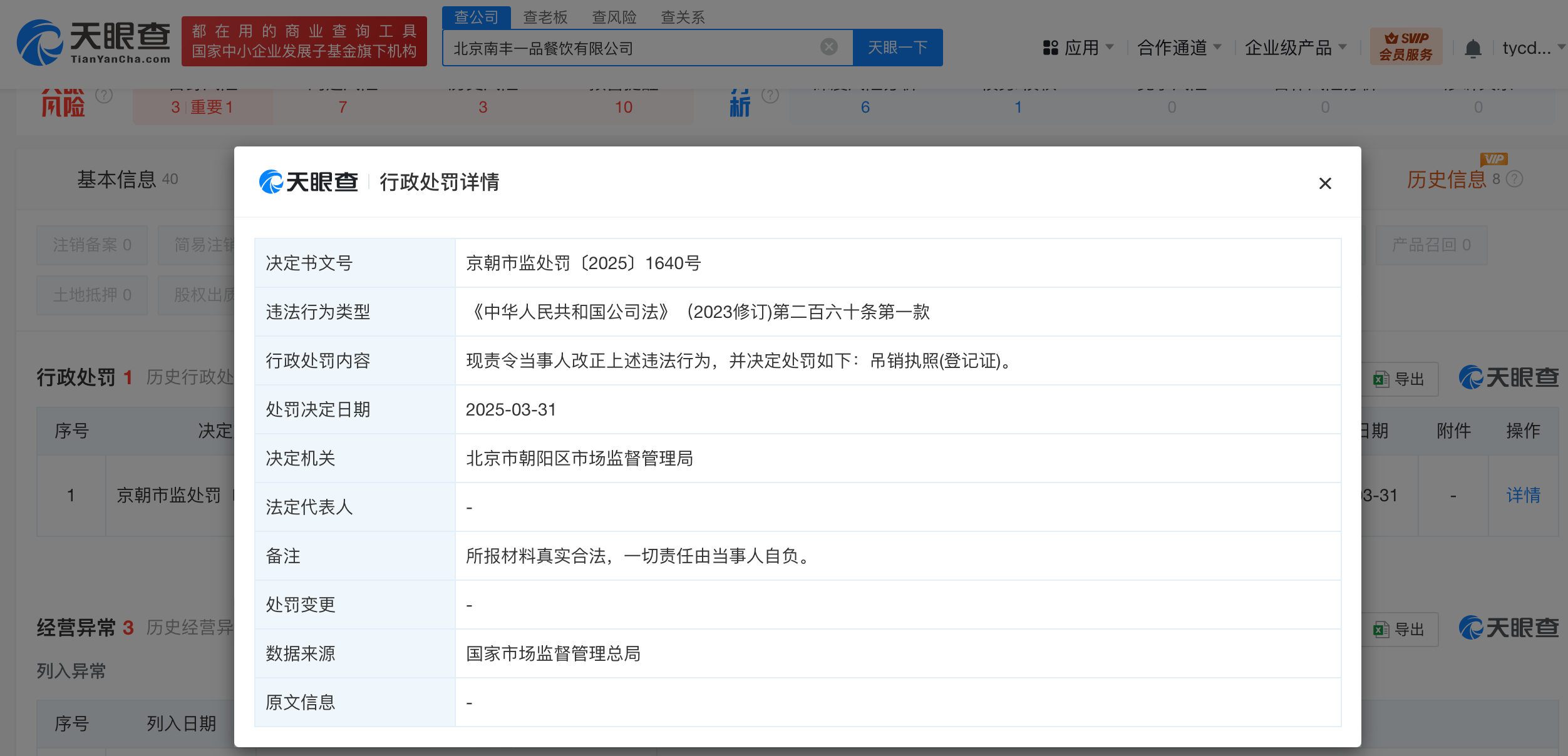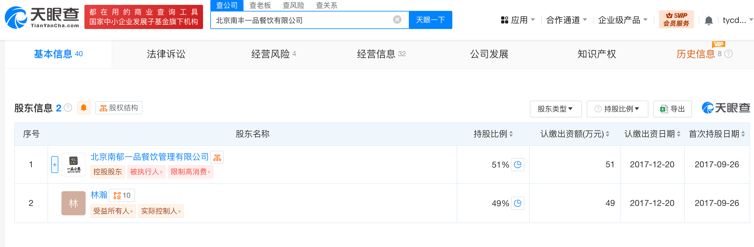 网红晚晚老公林瀚在晚晚直播间发现一素人女生评论了“中年老太无奈打工”后,发文在微博挂了一名素人女生的社交账号引发网友热议。天眼查App显示,林瀚名下共关联10家公司,均为存续状态,版图涉及传媒、餐饮、文化艺术、公关顾问等。其中,其持股49%的北京南丰一品餐饮有限公司,成立于2017年9月,法定代表人为崔瀚文,注册资本100万人民币。经营范围含餐饮服务、销售食品、销售电子产品、玩具、工艺品等。天眼风险显示,该公司曾在2023年、2024年多次被列入经营异常名录,近日已被北京市朝阳区市场监督管理局吊销执照(登记证)。