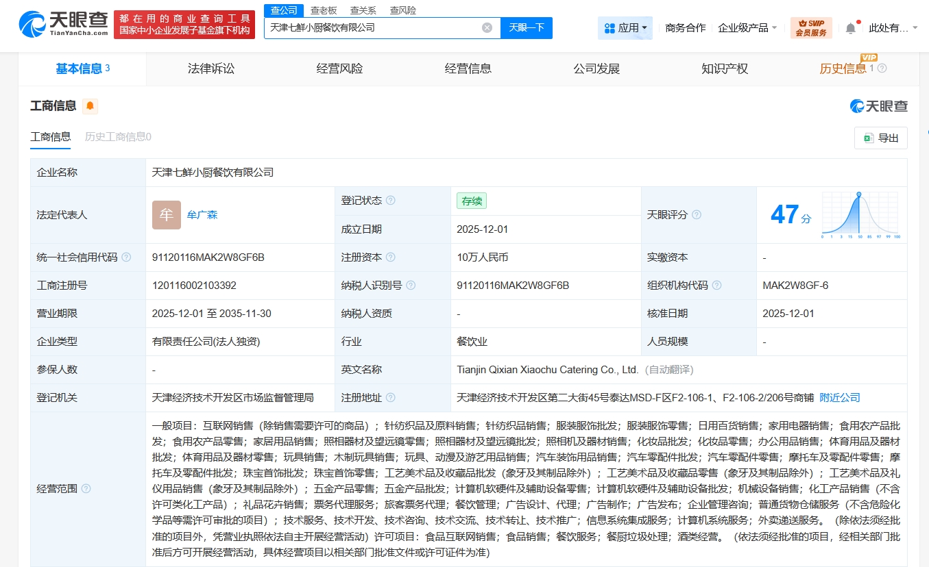 天眼查工商信息显示,12月1日,天津七鲜小厨餐饮有限公司成立,法定代表人为牟广森,注册资本10万人民币,经营范围含互联网销售、针纺织品及原料销售、日用百货销售、食用农产品零售、票务代理服务、旅客票务代理、餐饮管理等。股东信息显示,该公司由京东旗下北京七鲜小厨餐饮有限公司全资持股。