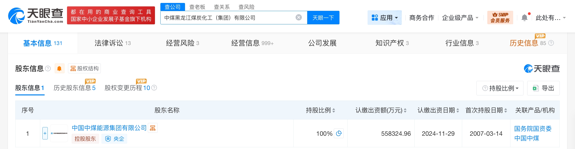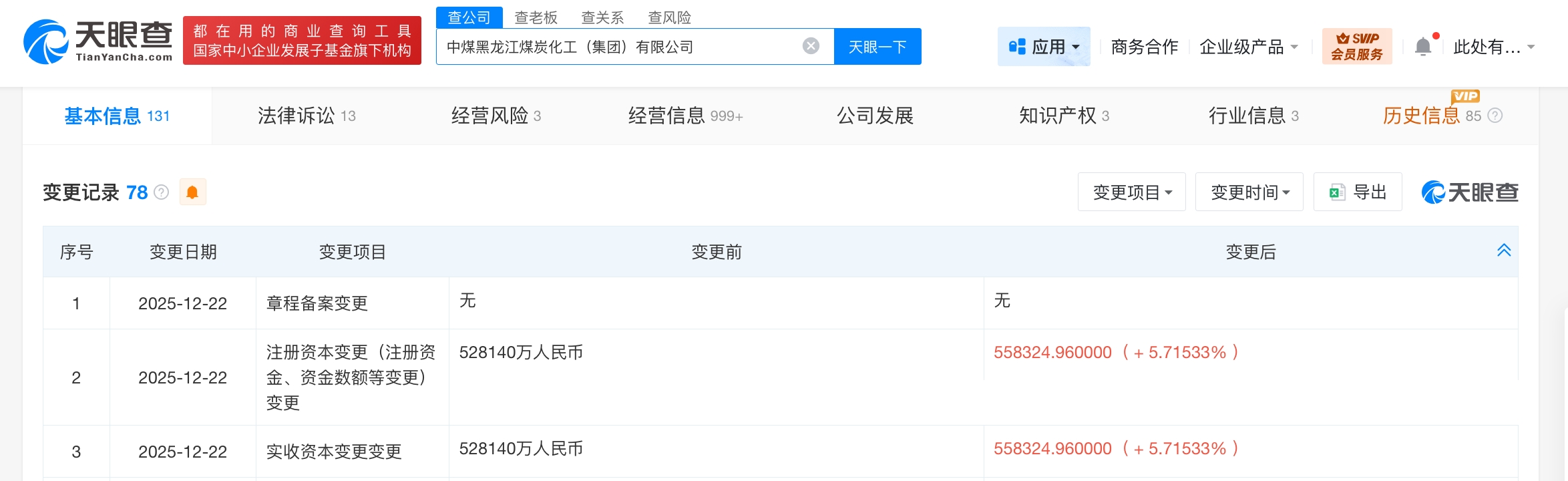 天眼查App显示,近日,中煤黑龙江煤炭化工(集团)有限公司发生工商变更,注册资本由约52.8亿人民币增至约55.8亿人民币,增幅约6%。