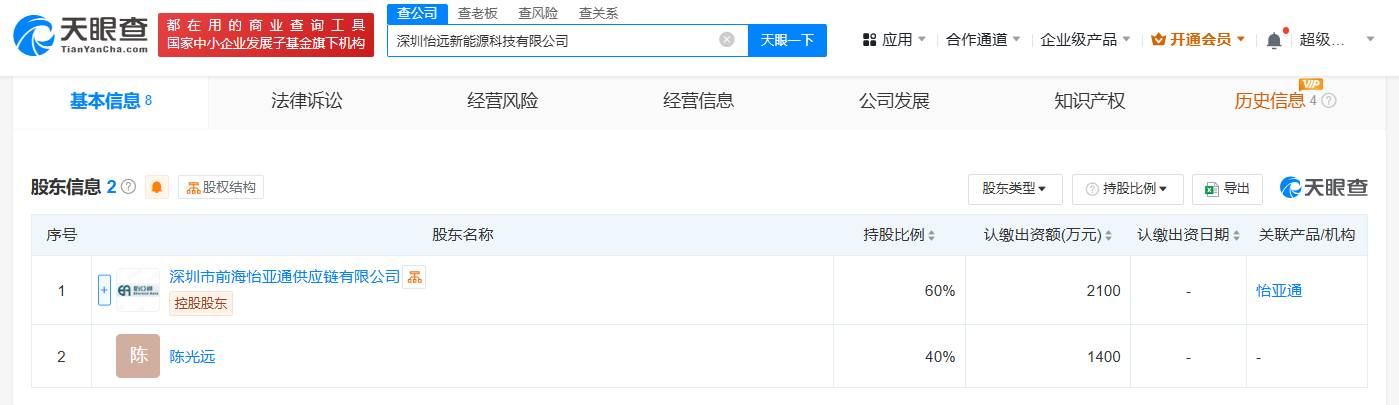 天眼查App显示,近日,深圳怡远新能源科技有限公司成立,法定代表人为陈光远,注册资本3500万人民币,经营范围包括非金属矿及制品销售、电子专用材料销售、电池销售、化工产品销售等。股东信息显示,该公司由怡亚通(002183)旗下深圳市前海怡亚通供应链有限公司、陈光远共同持股。