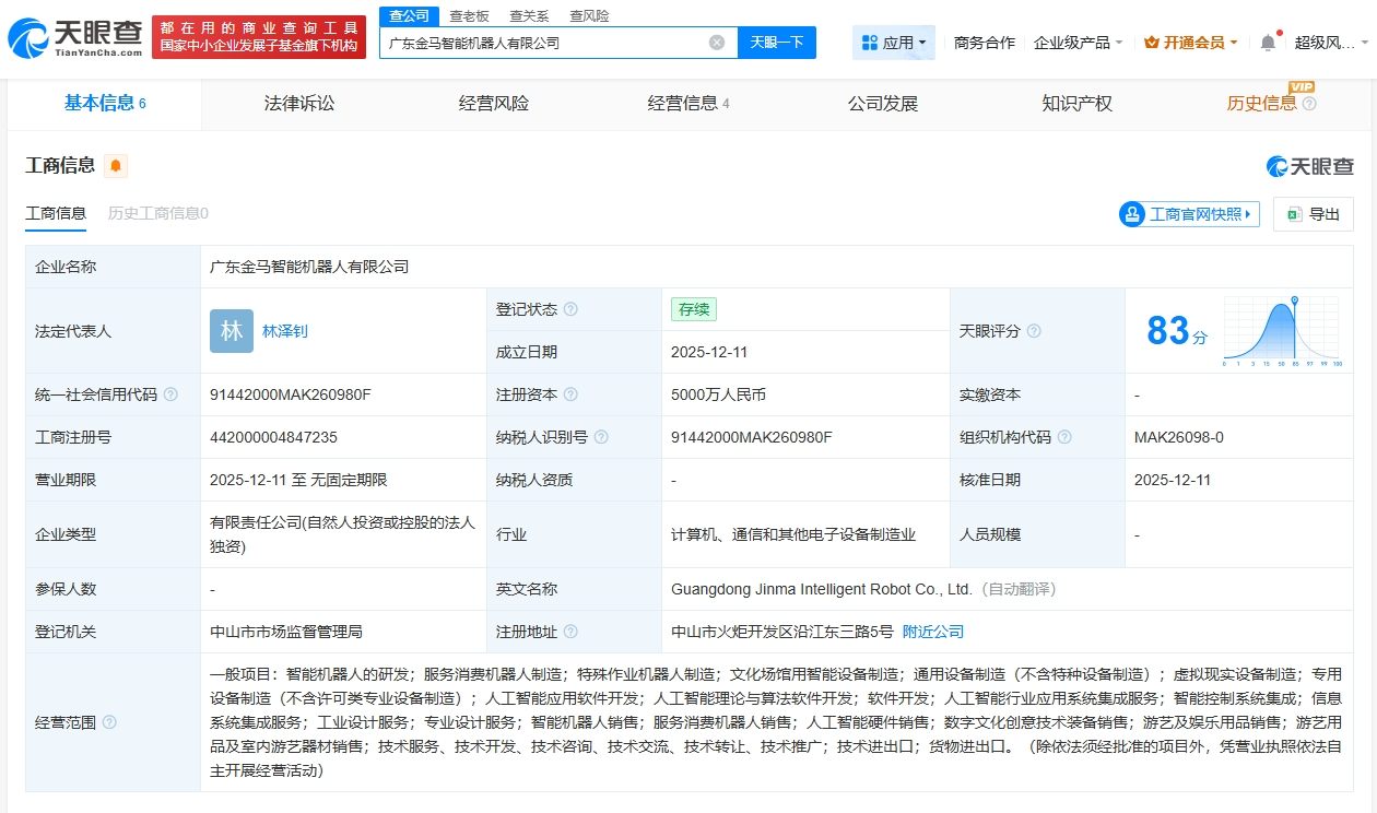 天眼查App显示,近日,广东金马智能机器人有限公司成立,法定代表人为林泽钊,注册资本5000万人民币,经营范围包括智能机器人的研发、服务消费机器人制造、特殊作业机器人制造等。股东信息显示,该公司由金马游乐(300756)全资持股。