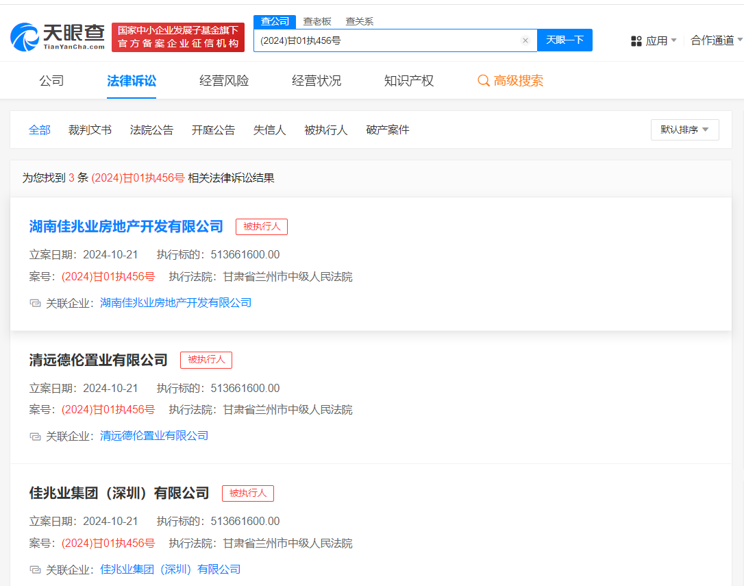 天眼查法律诉讼信息显示,10月21日,佳兆业集团(深圳)有限公司、湖南佳兆业房地产开发有限公司、清远德伦置业有限公司新增一则被执行人信息,执行标的5.1亿余元,执行法院为甘肃省兰州市中级人民法院。
