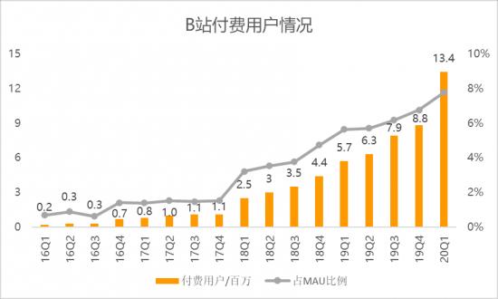 2020年Q1,B站月平均付费用户相比上季度净增460万(历史最佳),达到1340万,同比增长134%。