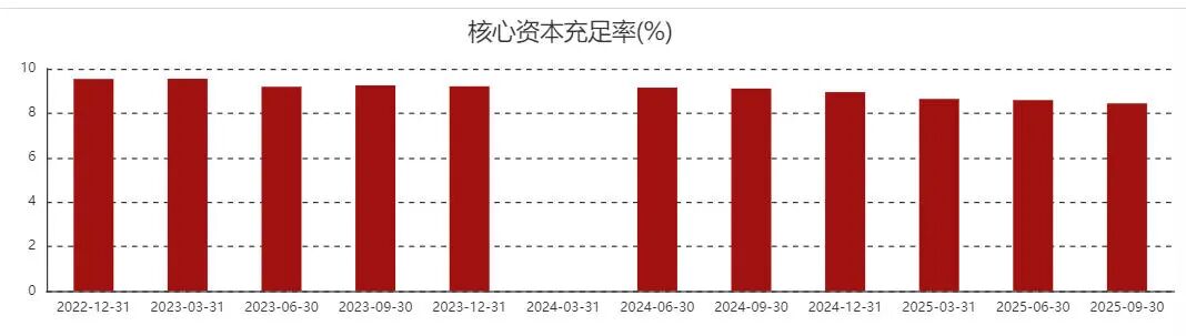 一方面,资本充足率不足形成硬性约束。根据相关政策,系统重要性银行的核心一级资本充足率通常为8.5%。北京银行属于系统重要性银行,所以实际需要满足的监管红线是8.5%,但2020年至2025年三季度末,其核心一级资本充足率分别为9.42%、9.86%、9.54%、9.21%、8.95%、8.44%,2025年三季度已跌破监管红线。