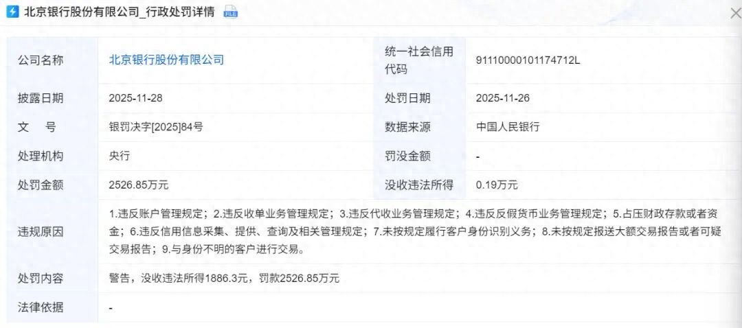 曾经的“城商行一哥”北京银行被监管机构开出一张超2500万元的巨额罚单,而这已是2020年以来第三笔超千万元级别的罚单。