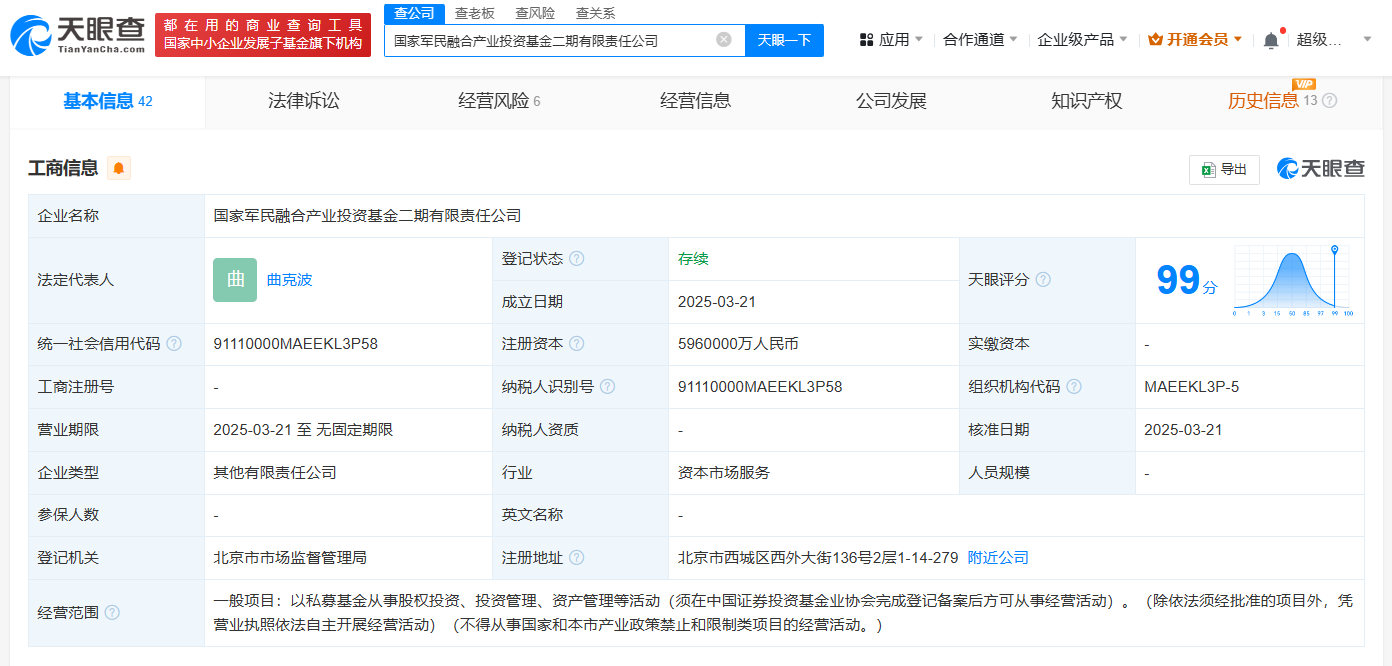 天眼查App显示,近日,国家军民融合产业投资基金二期有限责任公司成立,法定代表人为曲克波,注册资本596亿人民币,经营范围包括以私募基金从事股权投资、投资管理、资产管理等活动。
