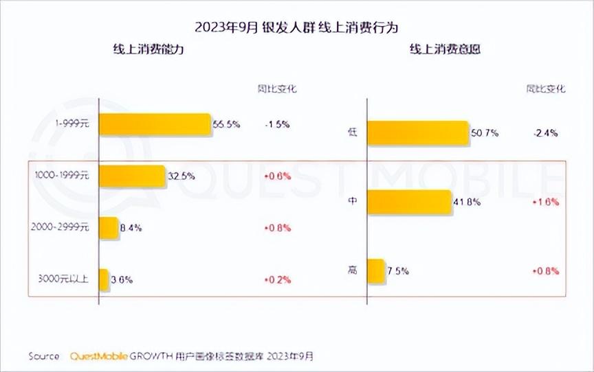 QuestMobile《2023银发经济洞察报告》显示,到2023年9月国内银发人群用户规模已达3.25亿,较上年增长超过2,300万,全网占比提升1.3个百分点。而且,银发群体表现出的线上消费能力、消费意愿均有明显提升。