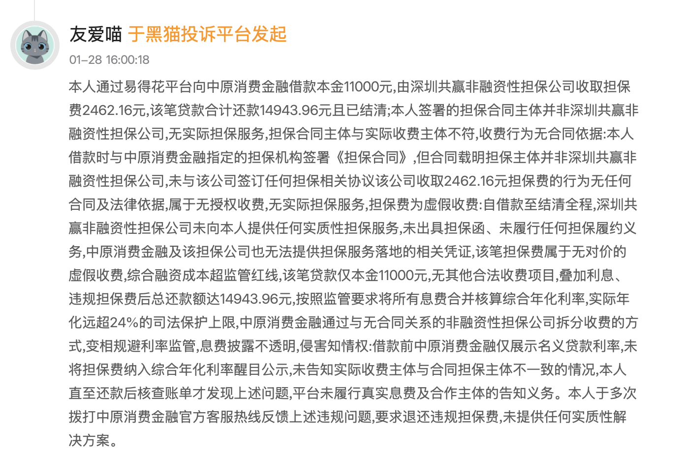 另有用户投诉表示,其通过易得花平台向中原消金借款本金11000元,深圳共赢非融资性担保公司向其收取2462.16元担保费,该笔贷款合计还款金额达14943.96元且已结清。